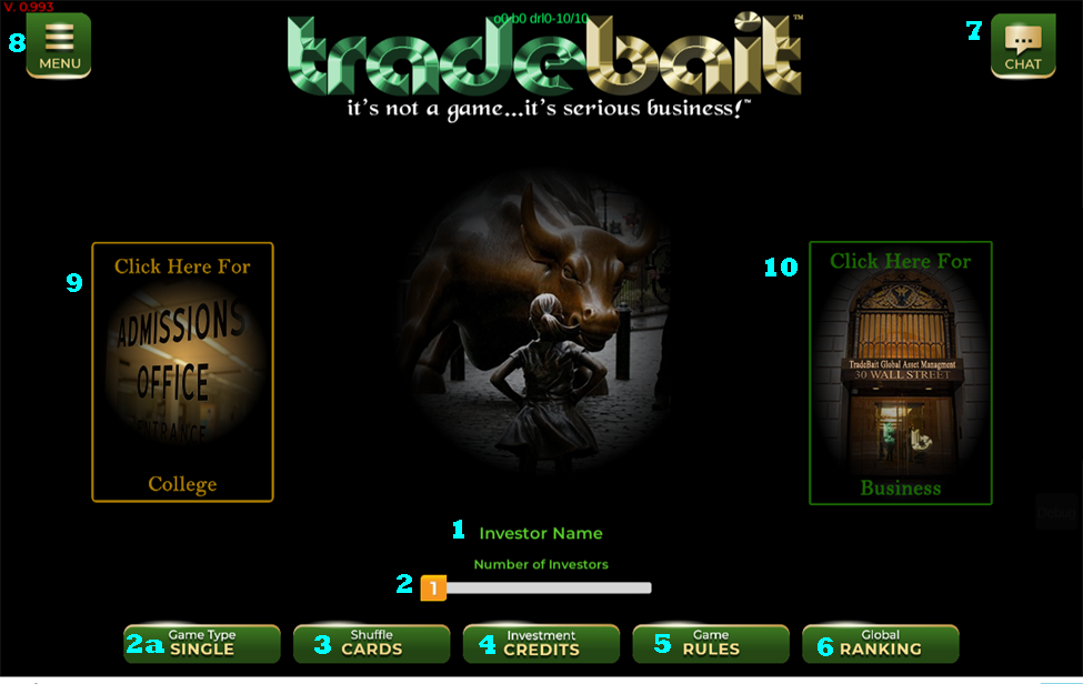 2. Choose How Many Investors: Slide the Yellow Bar to desired amount. This is where you practice playing vs. the Bots. (Bot play is not available at this time. Still working out some glitches)